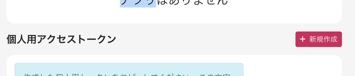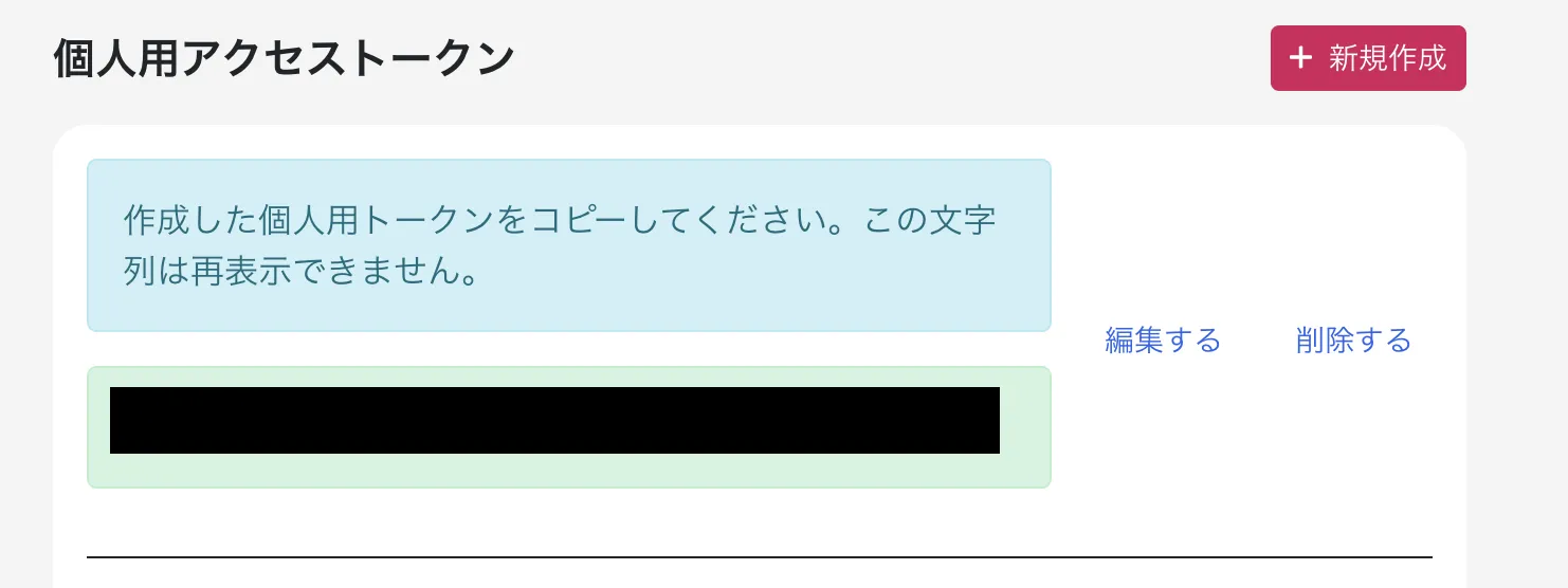 アクセストークンが表示されるのでこれを適当なところにコピーしててくださいね。再表示できないので。