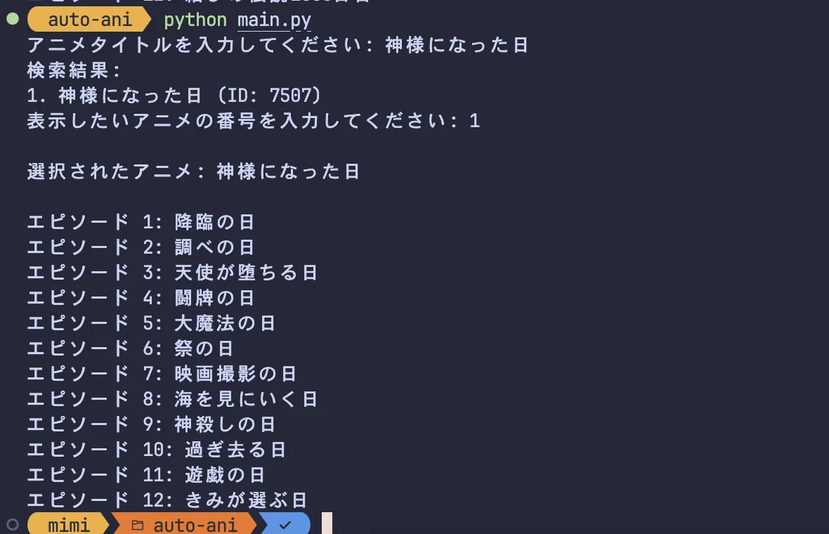 print(f"\n選択されたアニメ: {selected_anime['title']}\n")