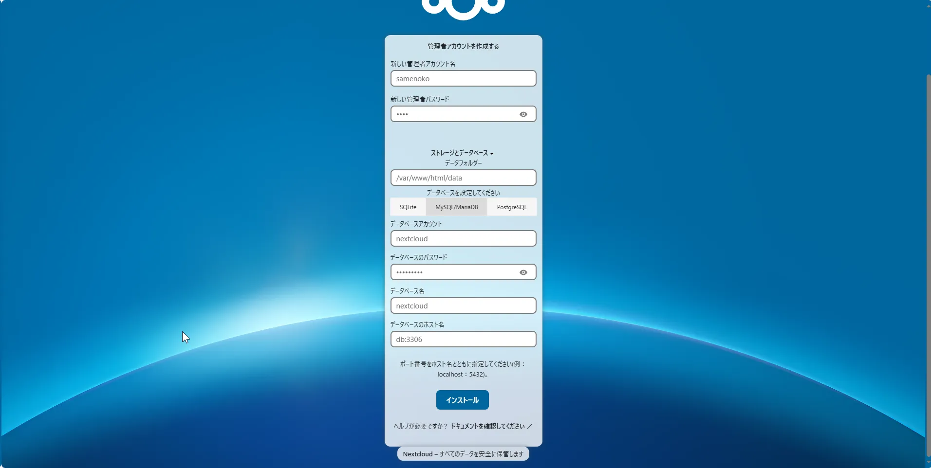 管理者アカウント情報はお好みでやるとして、データベースに関しては以下の通りにします。